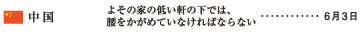 中国	よその家の低い軒の下では、腰をかがめていなければならない 6月3日