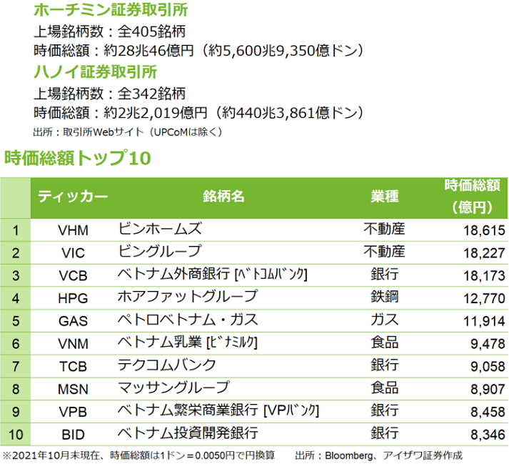 | 呼び値 | ホーチミン:株価に応じて10〜100ドン ハノイ :株価に関係なく100ドン |